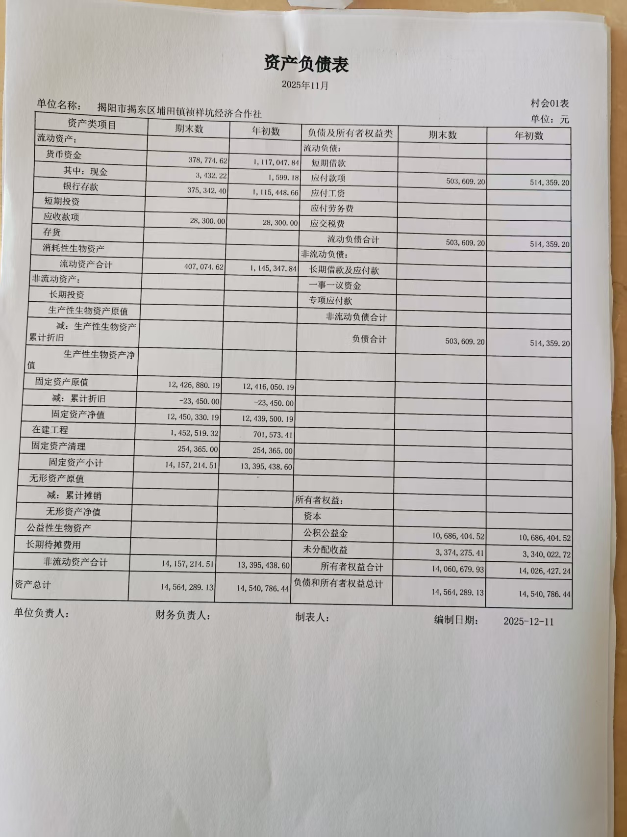 2025年11月集体经济情况