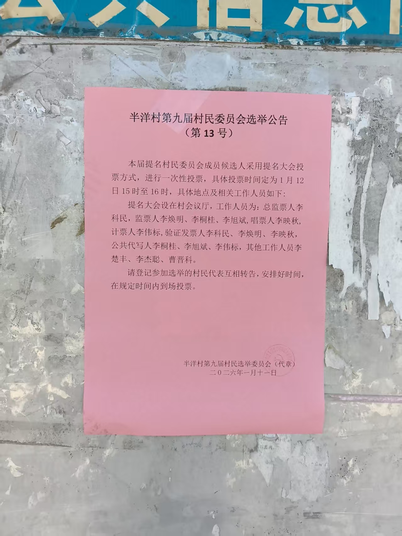 玉滘镇半洋村第九届村民委员会选举公告(第13号)