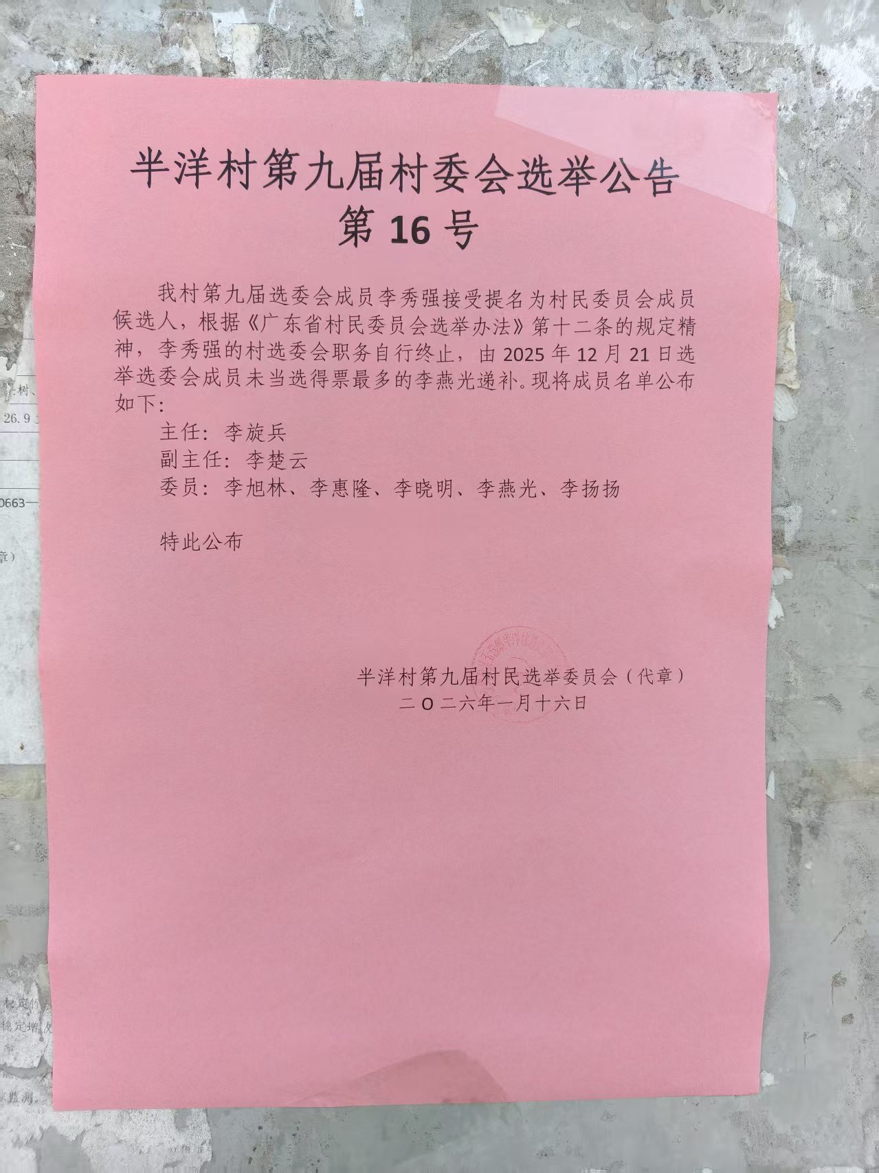 玉滘镇半洋村第九届村民委员会选举公告(第16号)