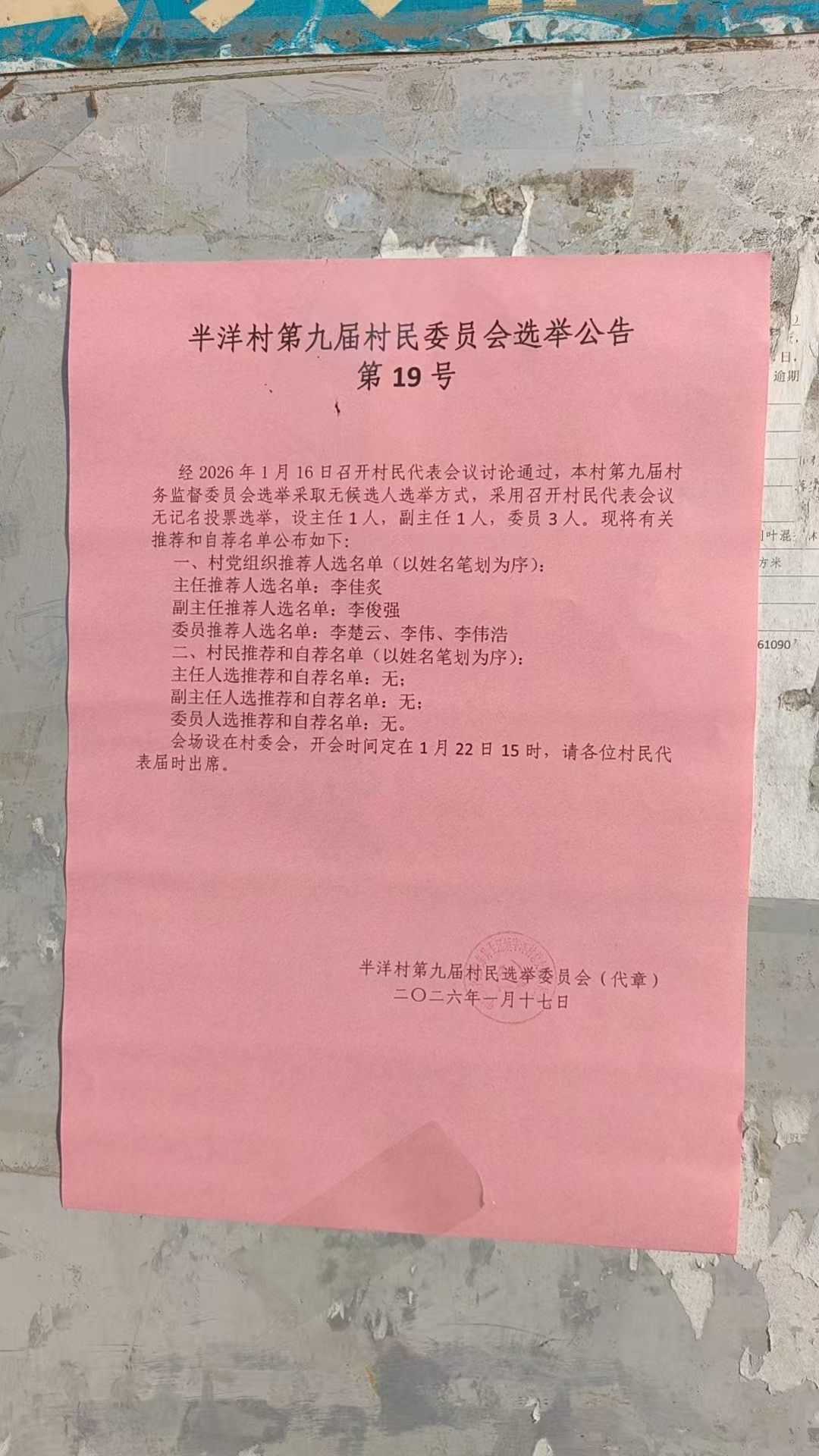 玉滘镇半洋村第九届村民委员会选举公告(第19号)