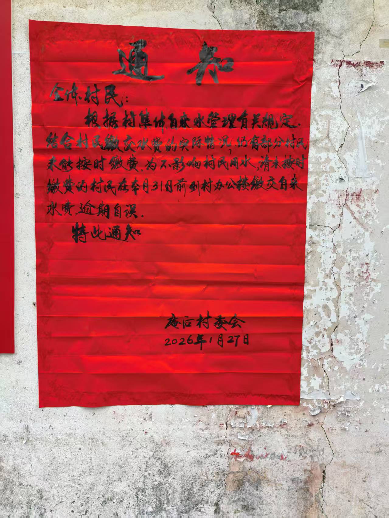 庵后村2026年1月份追缴水费通知