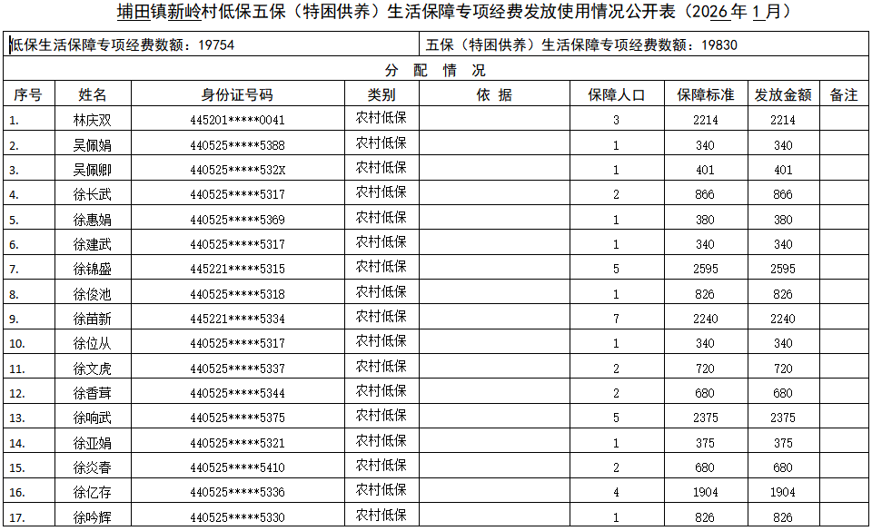 (2026年1月)低保、五保(特困人员)生活保障专项经费的数额、分配、使用情况分配情况