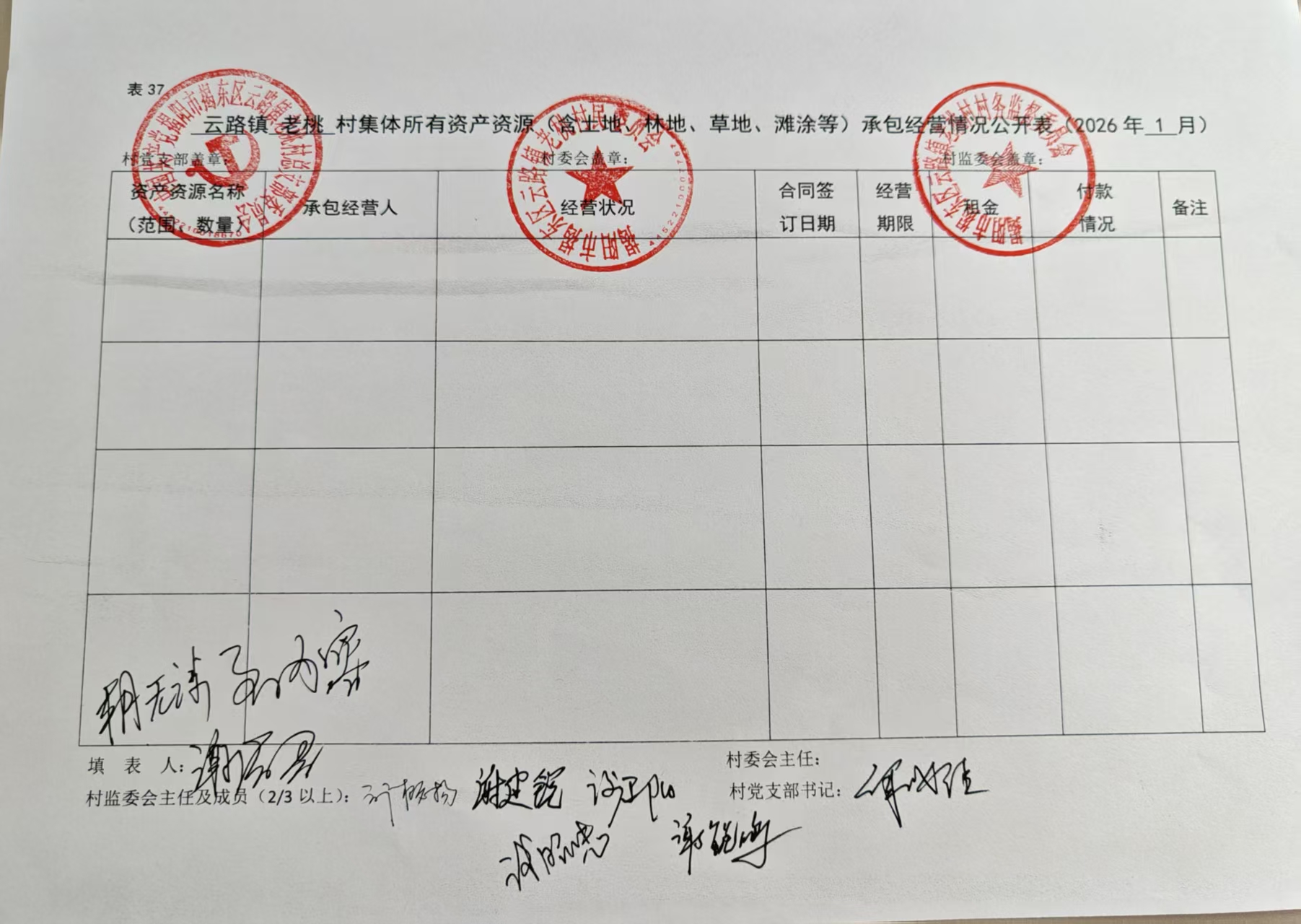 2026年云路镇老桃村集体所有资产资源(含土地、林地、草地、滩涂等)承包经营情况公开表(1月份)