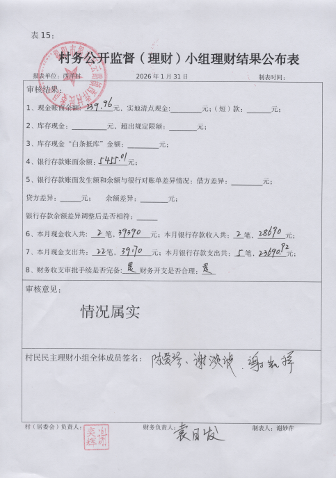 2026年1月村务公开监督(理财)小组理财结果公布表