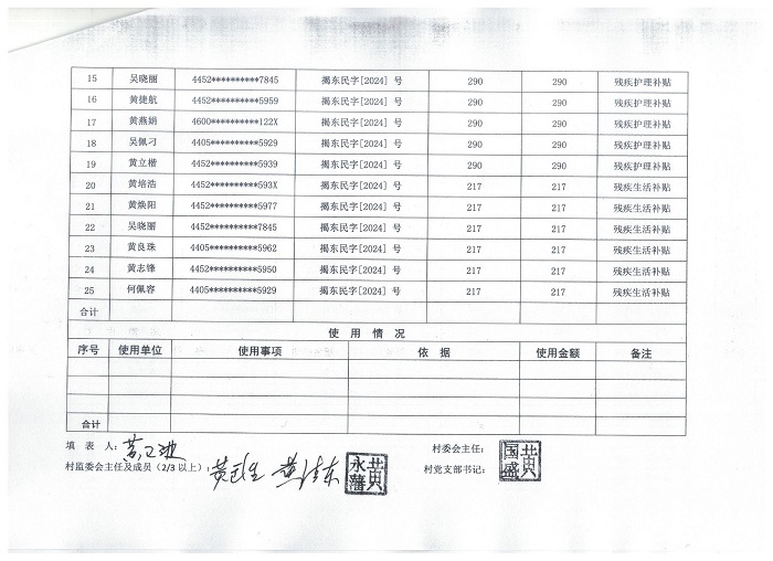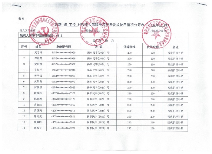 云路镇下径村残疾人保障专项经费发放使用情况公开表2026年1月