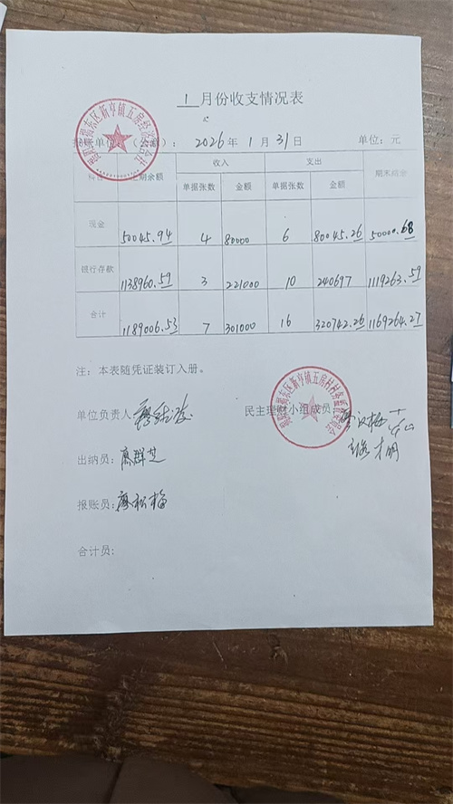 五房村2026年1月各项收入、支出明细及现金、银行存款余额