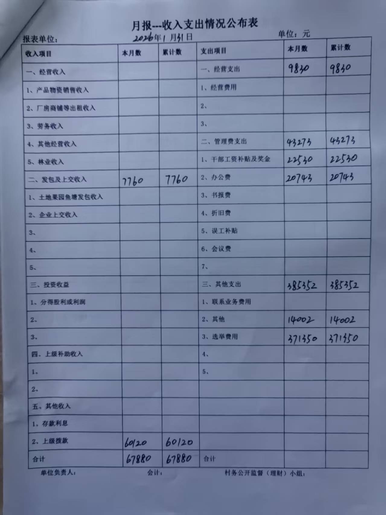 2026年1月份收入支出情况公布表