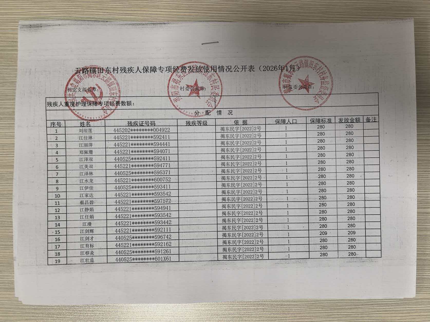 2026年1月残疾补贴公示