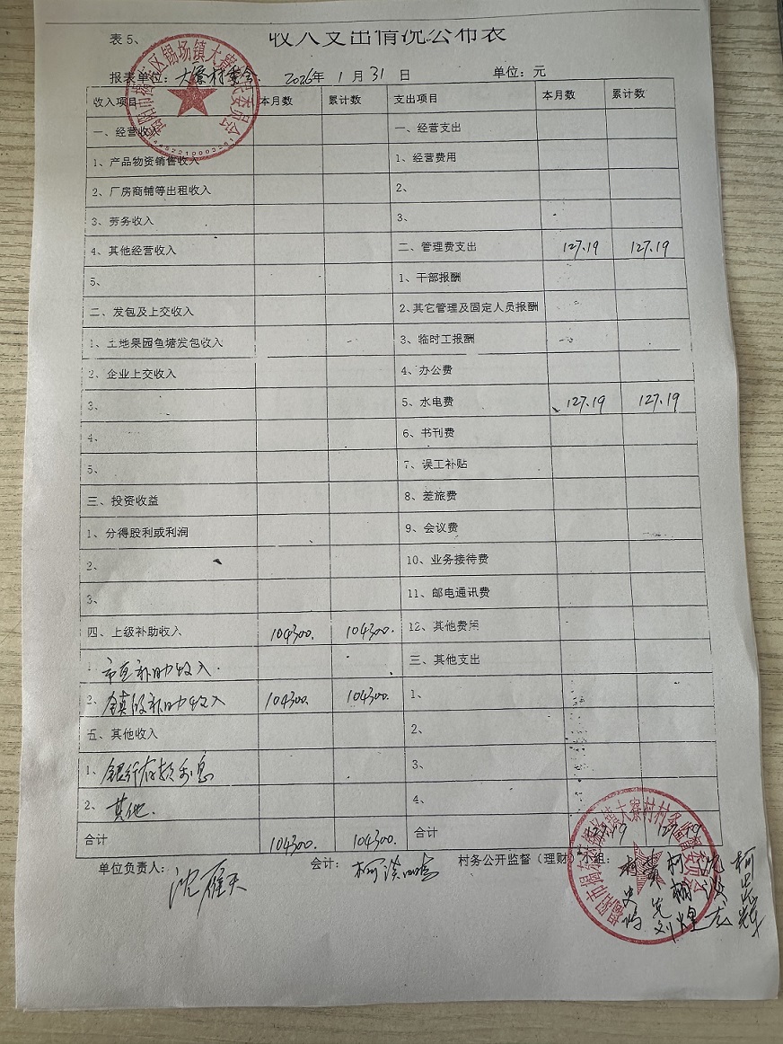 大寮村2026年1月财务收支情况