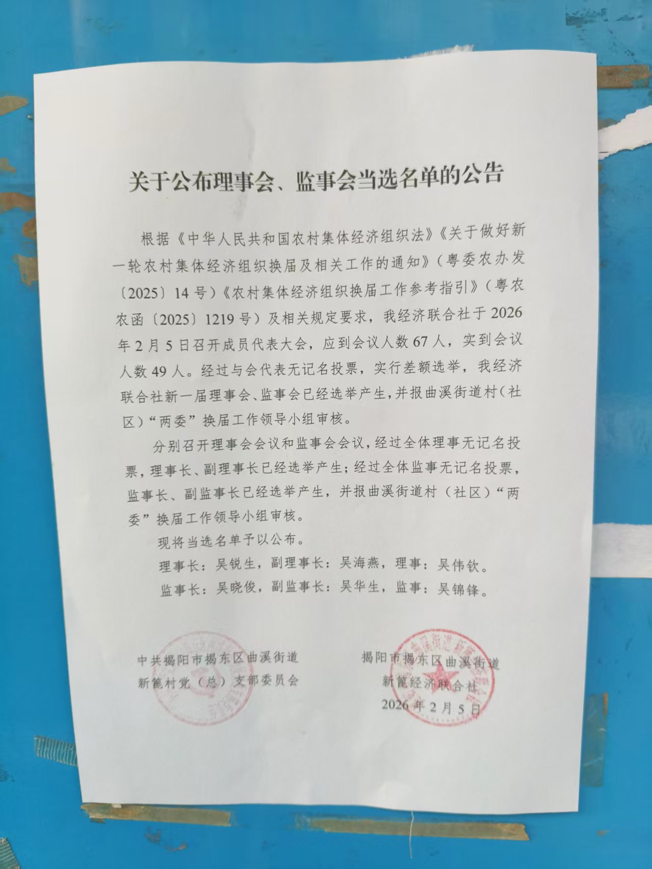 关于公布理事会、监事会当选名单公告