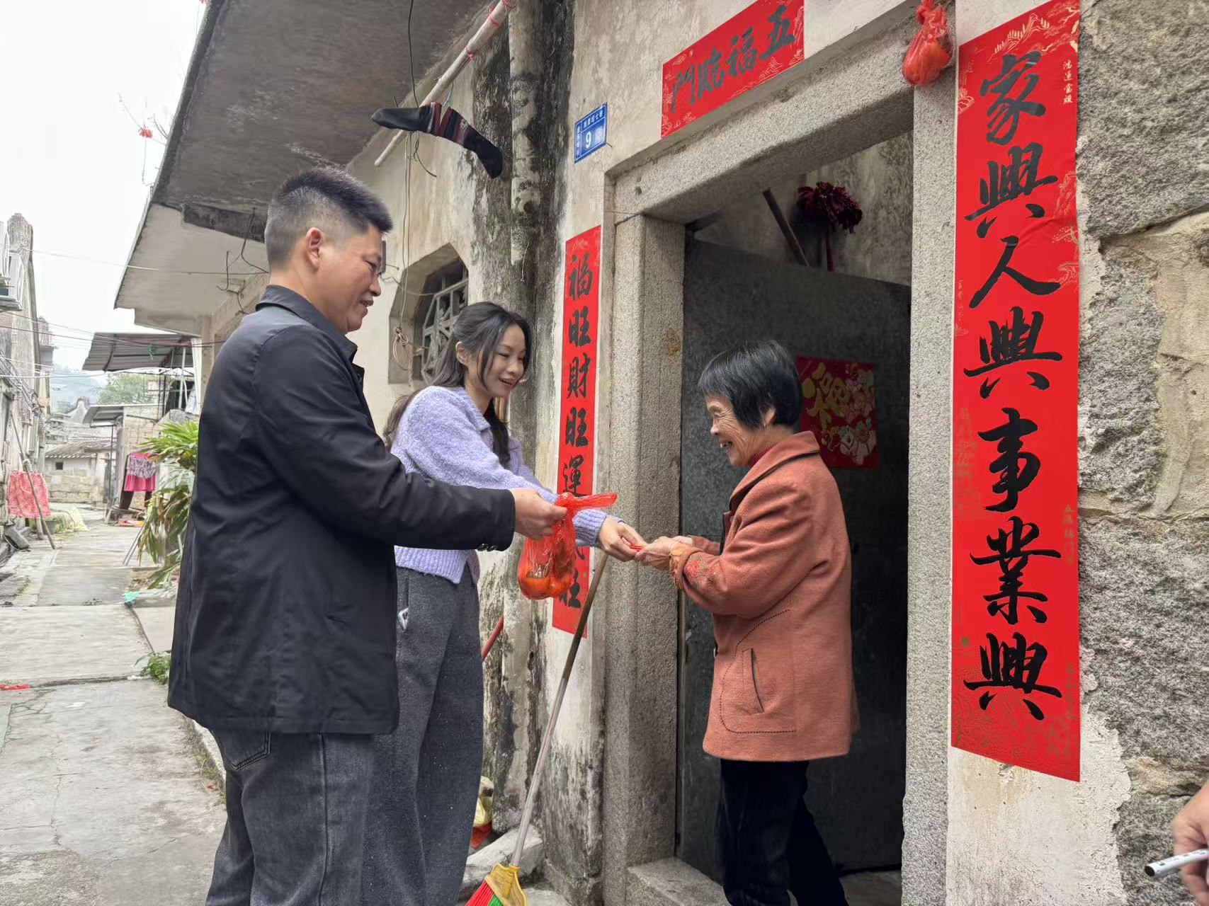 2026年2月12日,埔田镇镇委委员陈玲玲、文化站站长江东宏、金东岭村党总支部书记罗沛鑫及村“两委”、工作人员组队走访慰问金东岭村区域内的贫困户、老党员,向他(她)们致以美好的新春祝福及送上慰问金。