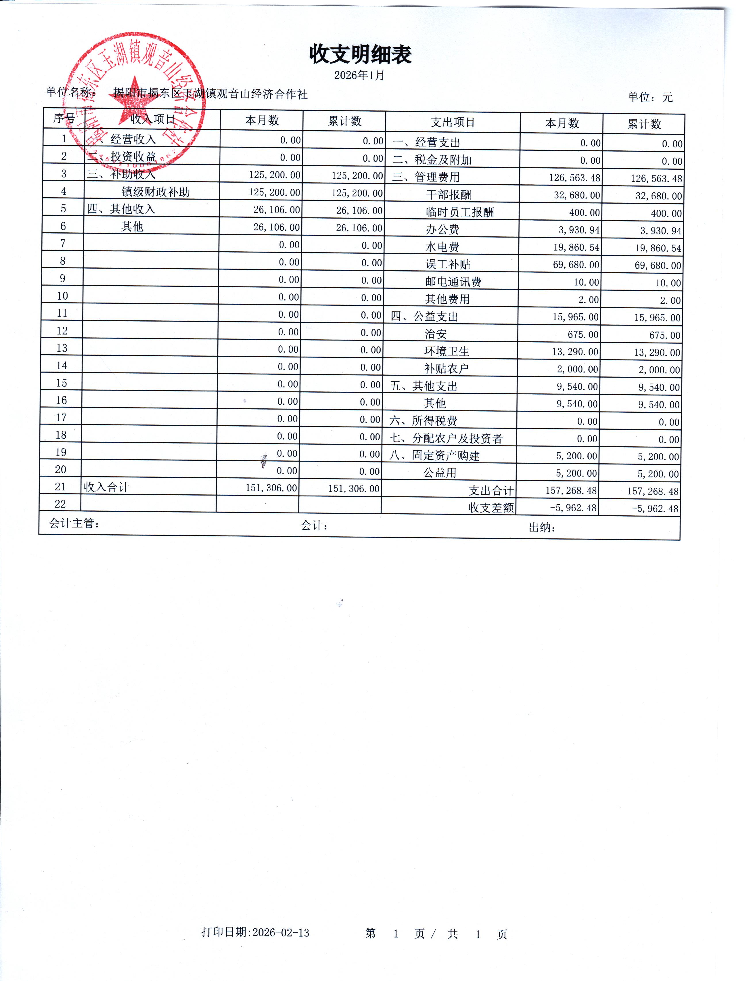 2026年1月份财务收支情况