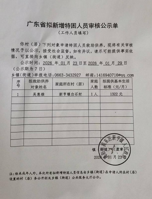 广东省拟新增特困人员审核公示单