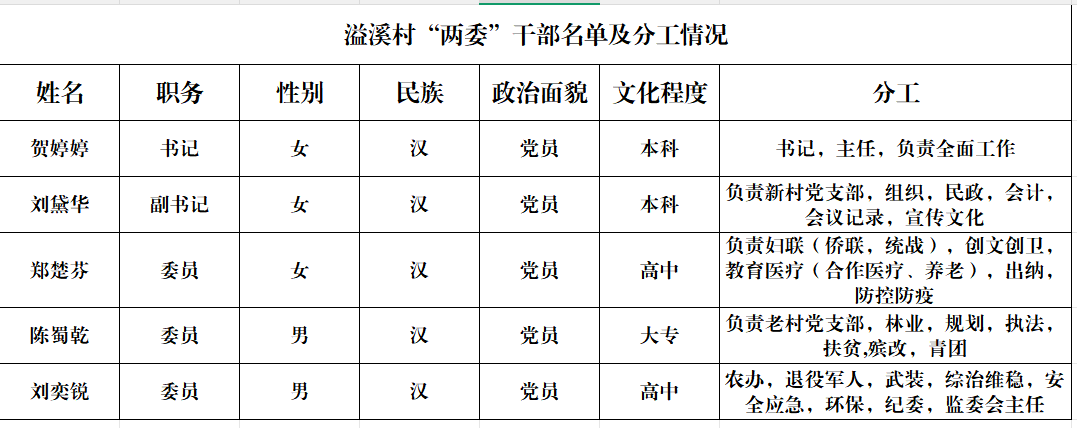 溢溪村“两委”干部名单及分工情况