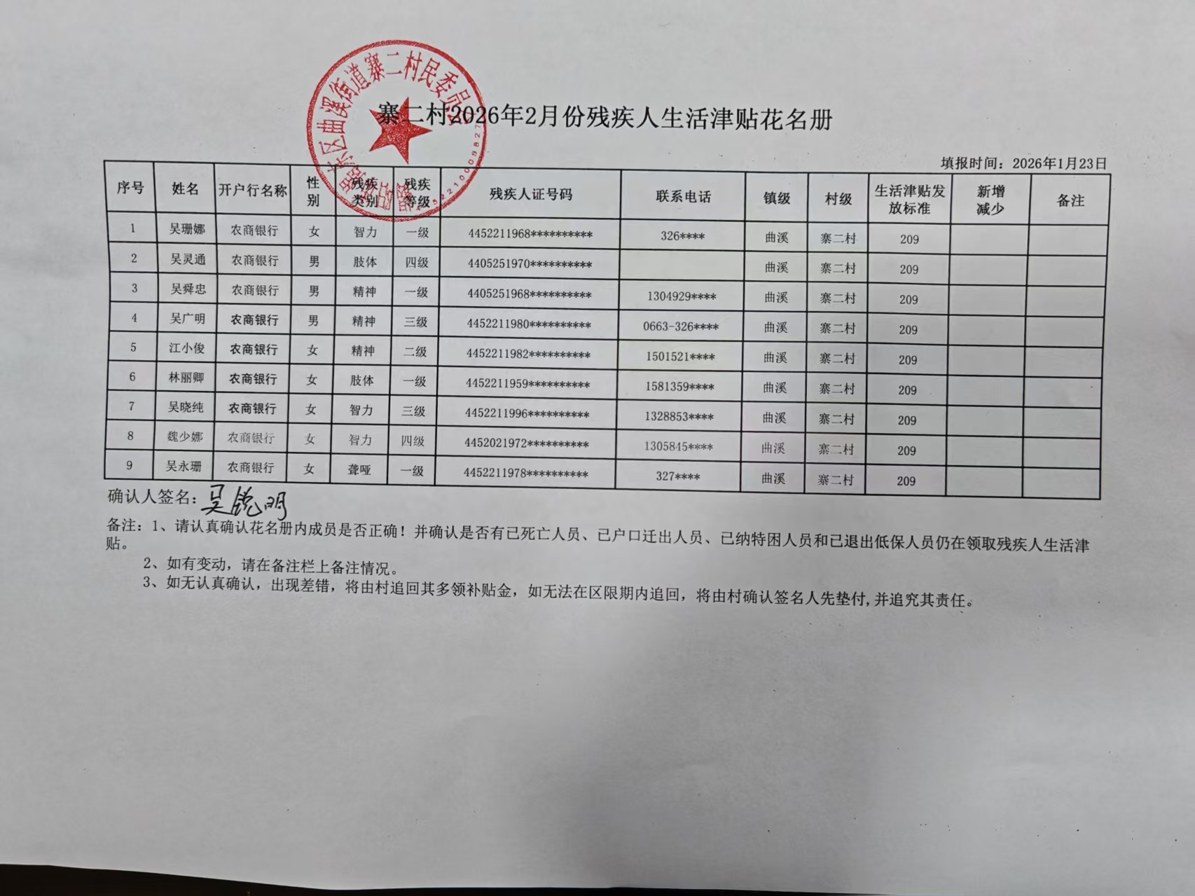 寨二村2026年2月份残疾人生活津贴花名册