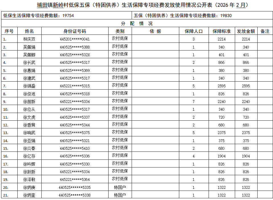 (2026年2月)低保、五保(特困人员)生活保障专项经费的数额、分配、使用情况分配情况