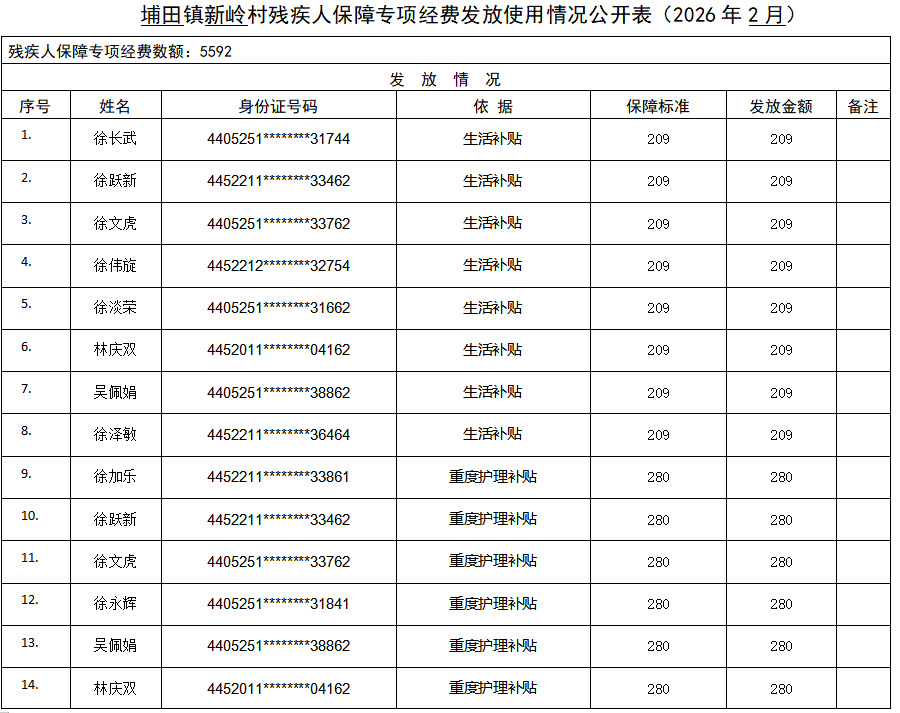 (2026年2月)残疾人保障专项经费的数额、分配、使用情况发放情况