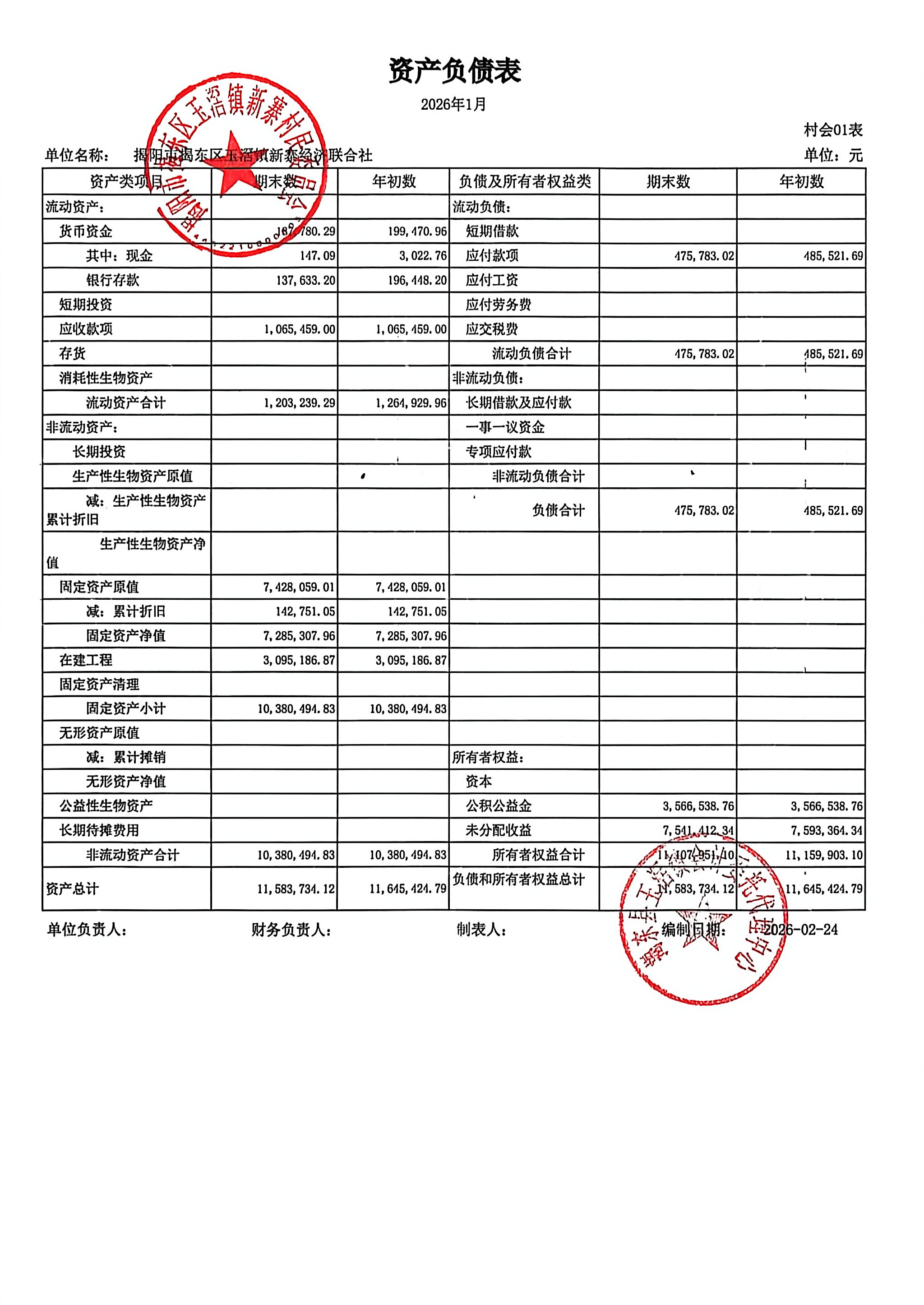 2026年1月新寨村三资情况