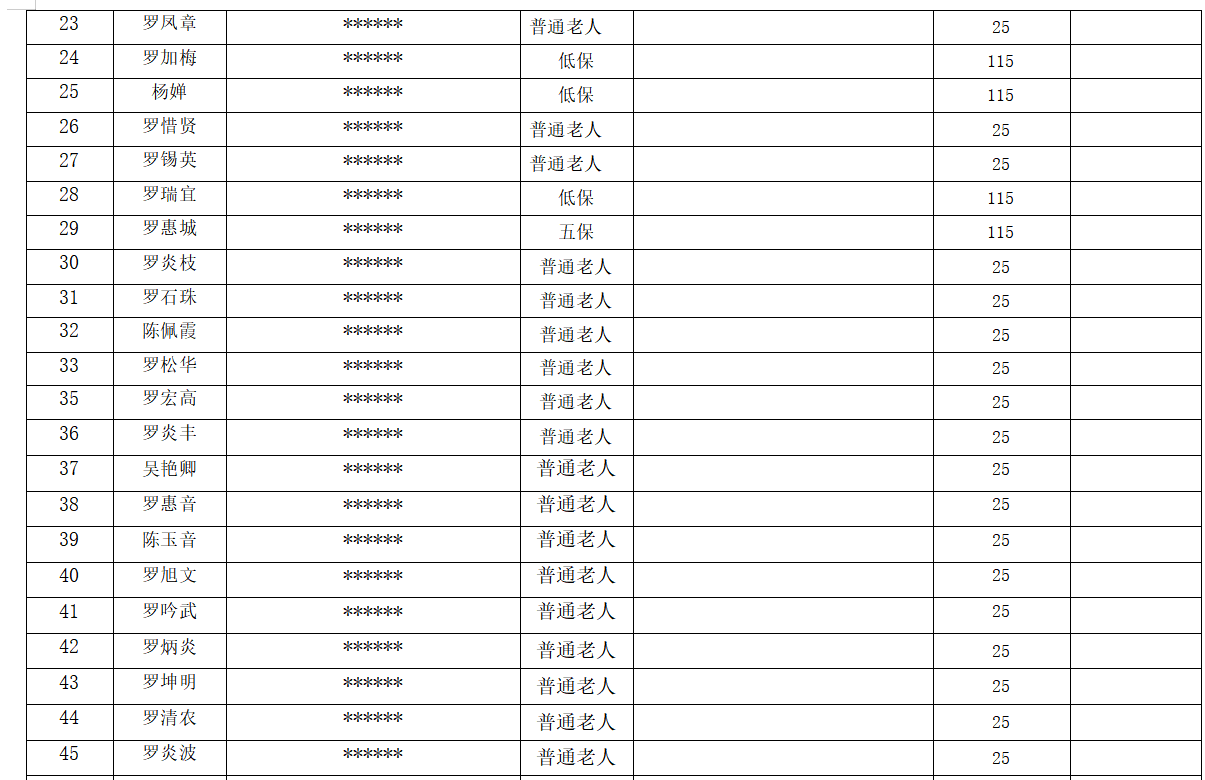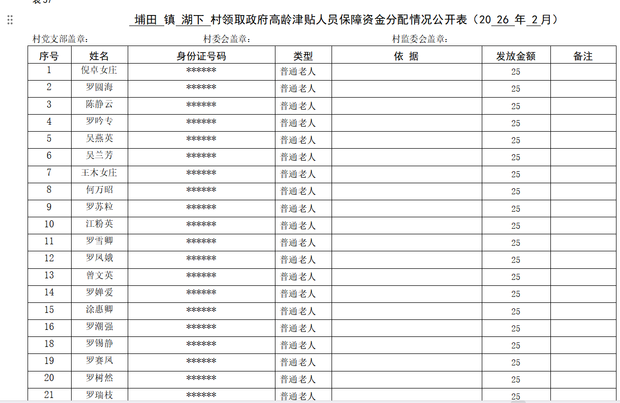 埔田 镇 湖下 村领取政府高龄津贴人员保障资金分配情况公开表(20 26 年 2月)