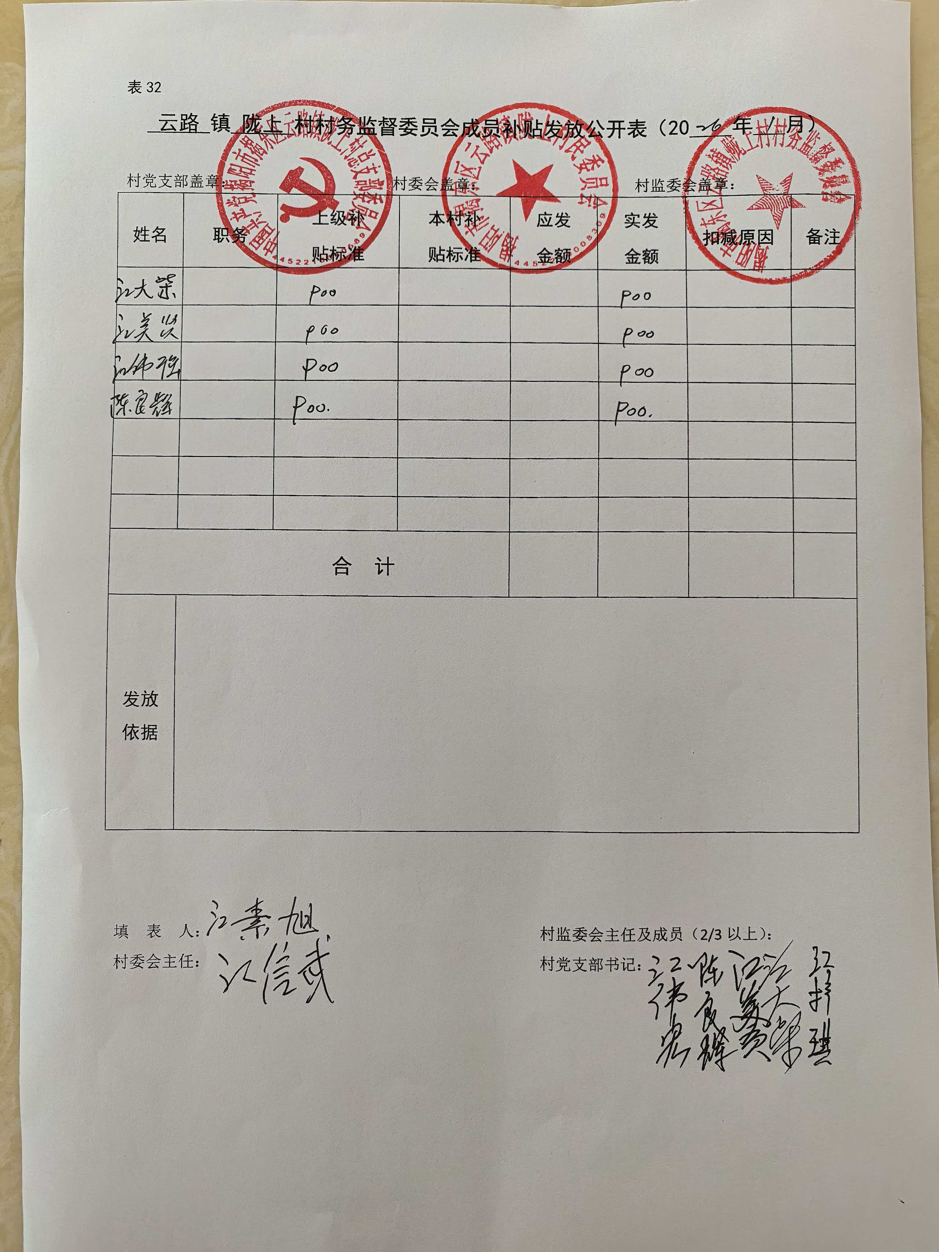 云路镇陇上村村务监督委员会成员补贴发放公开表(2026年1月)