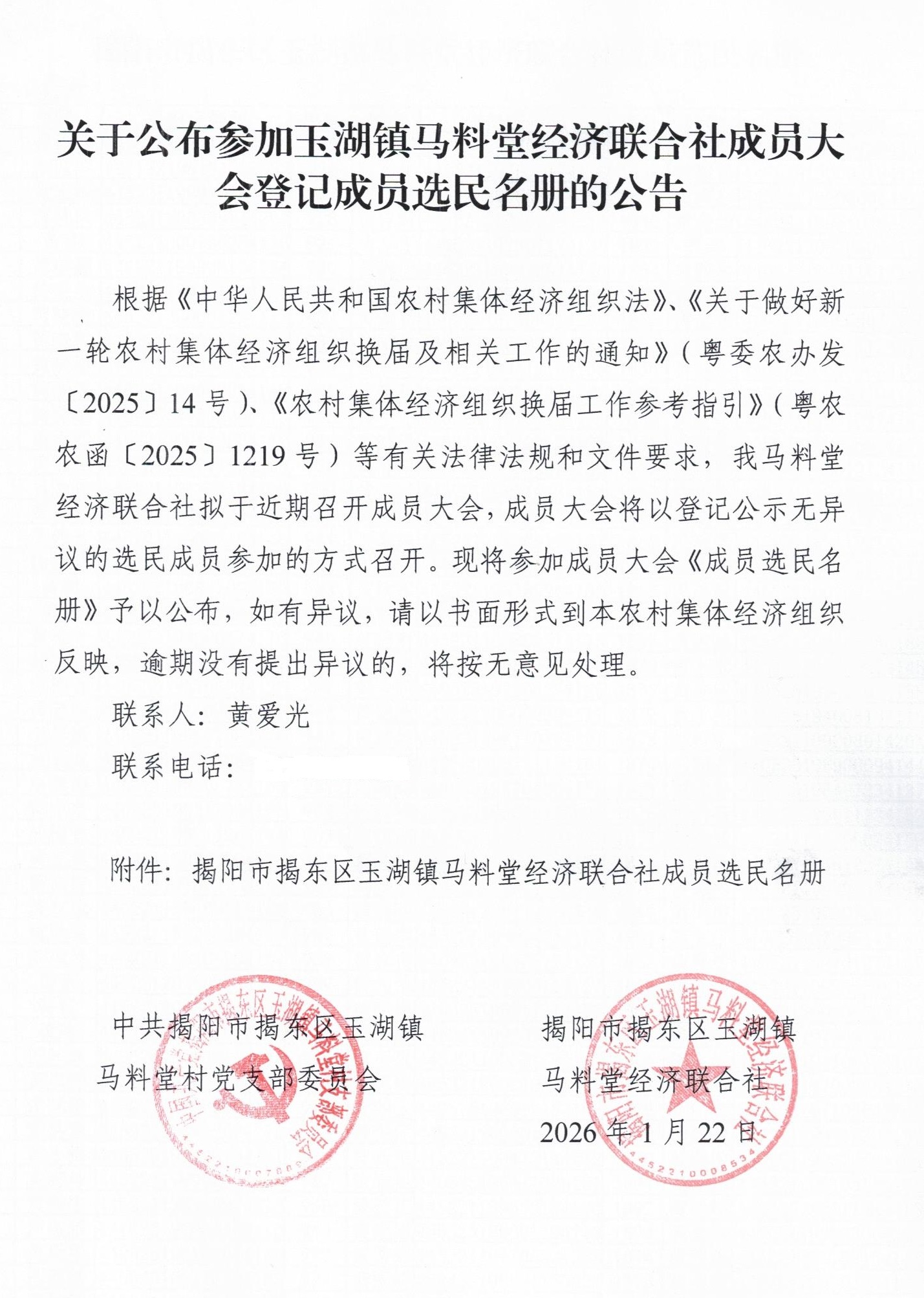 马料堂村经济联合社选民名册公告