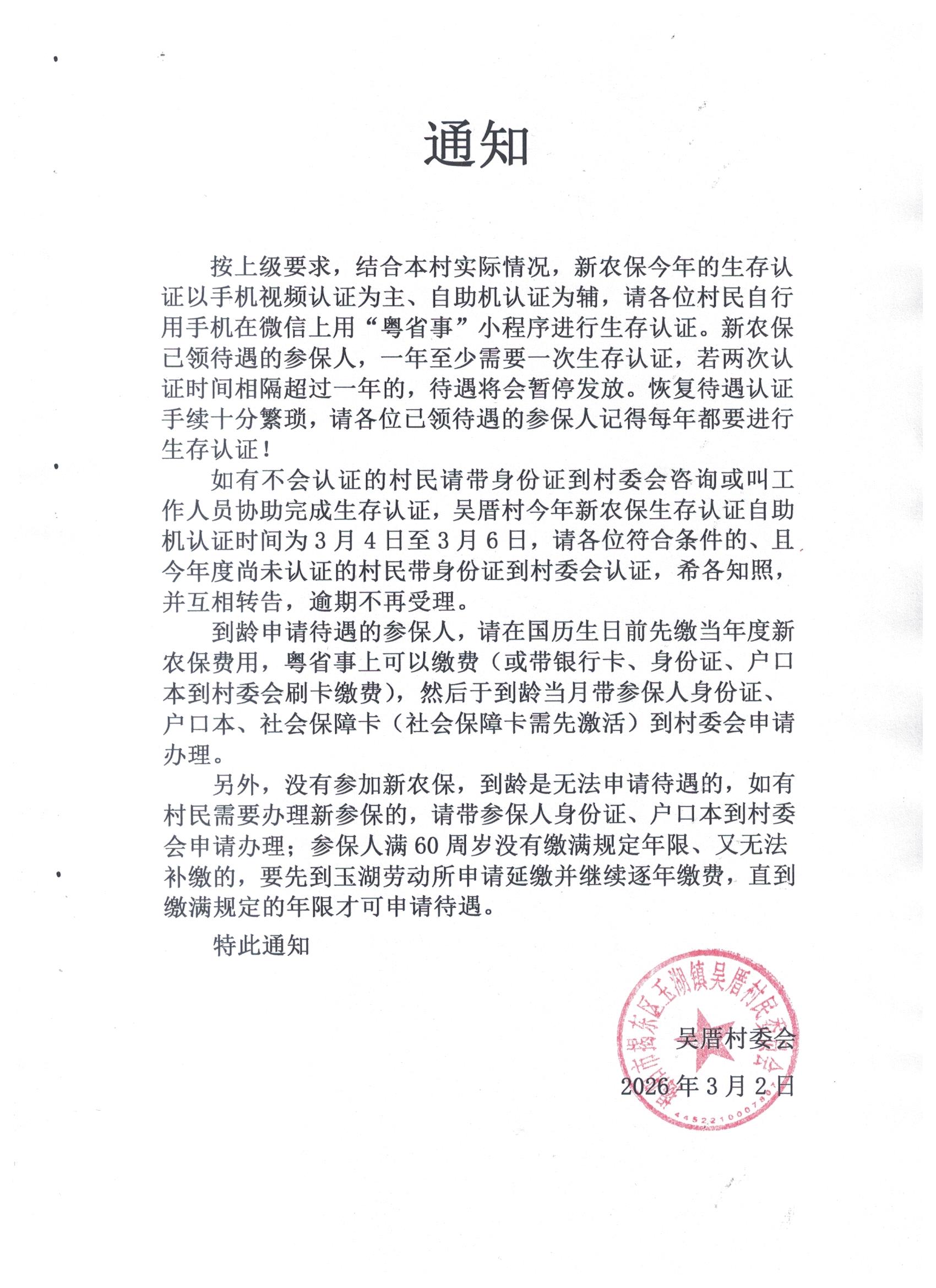2026年度新农保生存认证通知