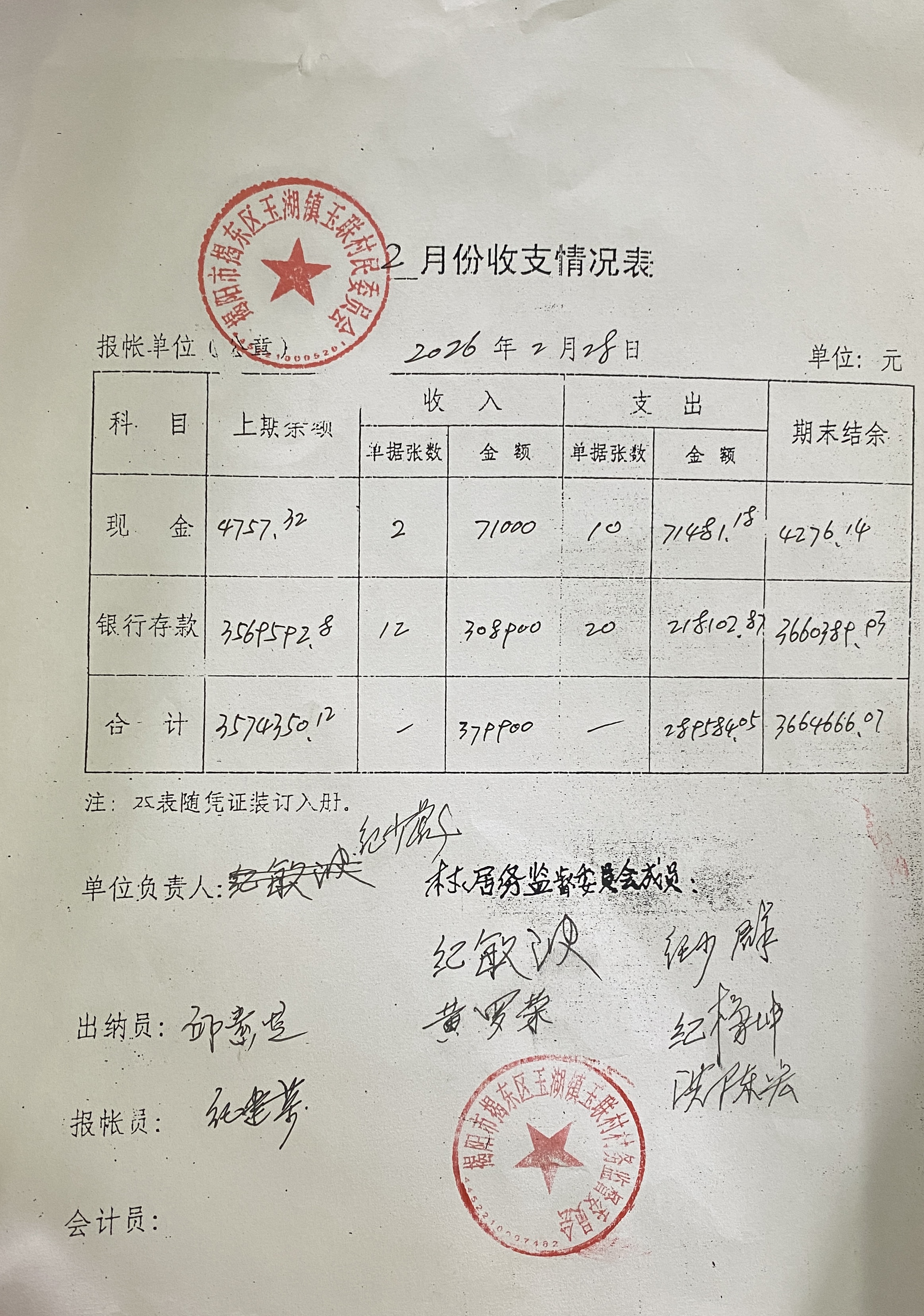 玉联村2026年2月收支明细表