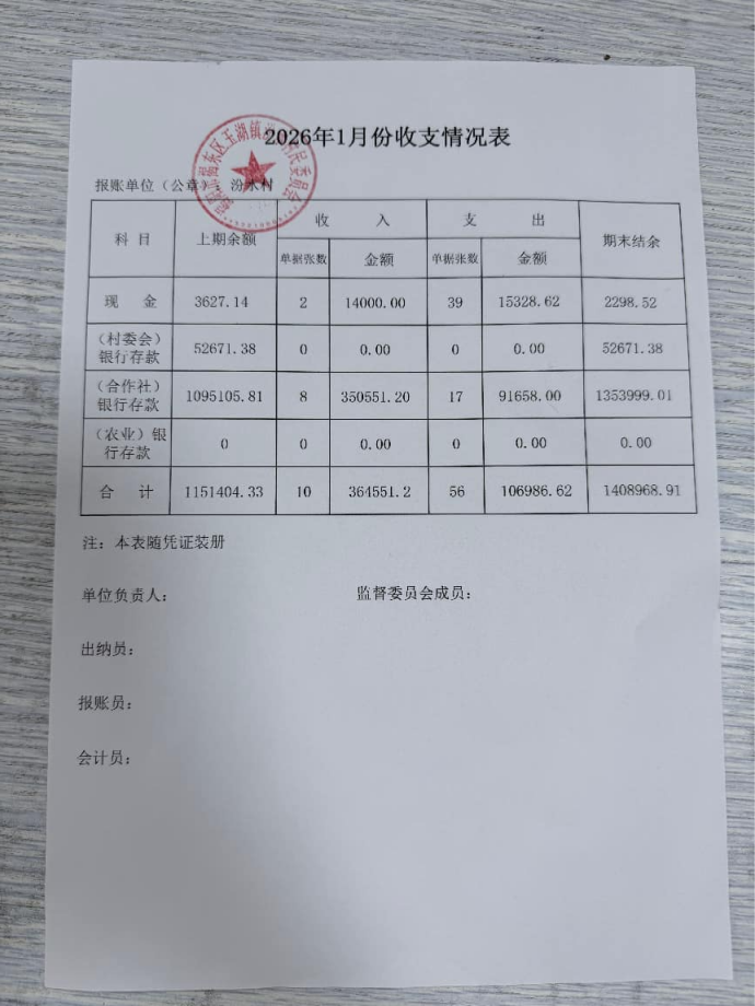 汾水村2026年1月收入支出情况公布表