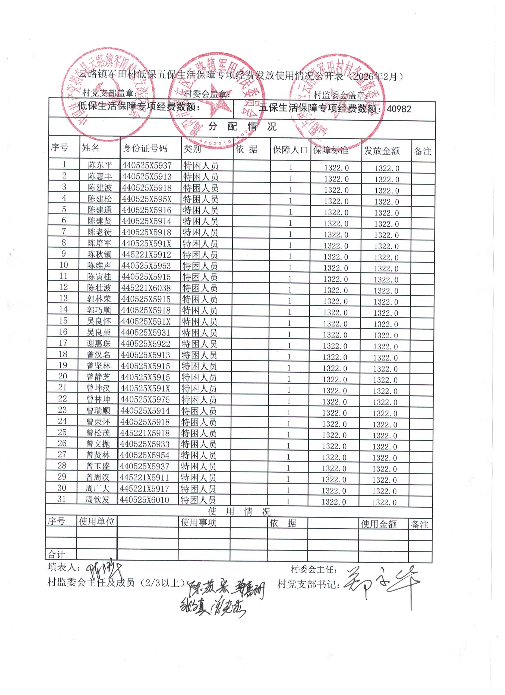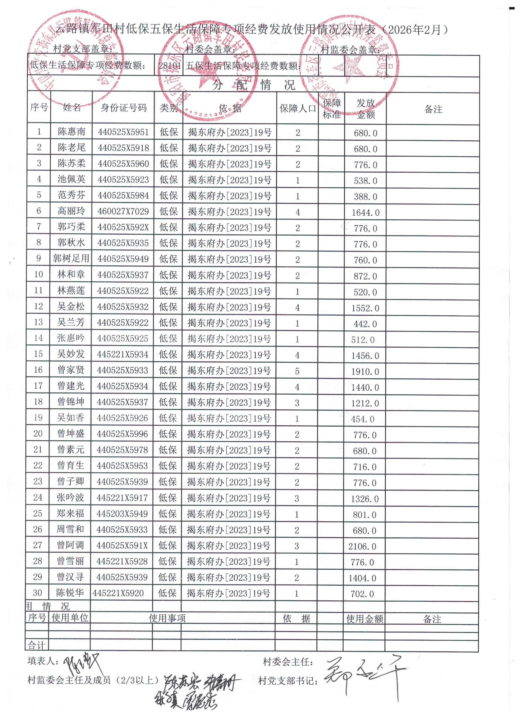 2026年2月低保、五保生活保障专项经费发放使用情况表