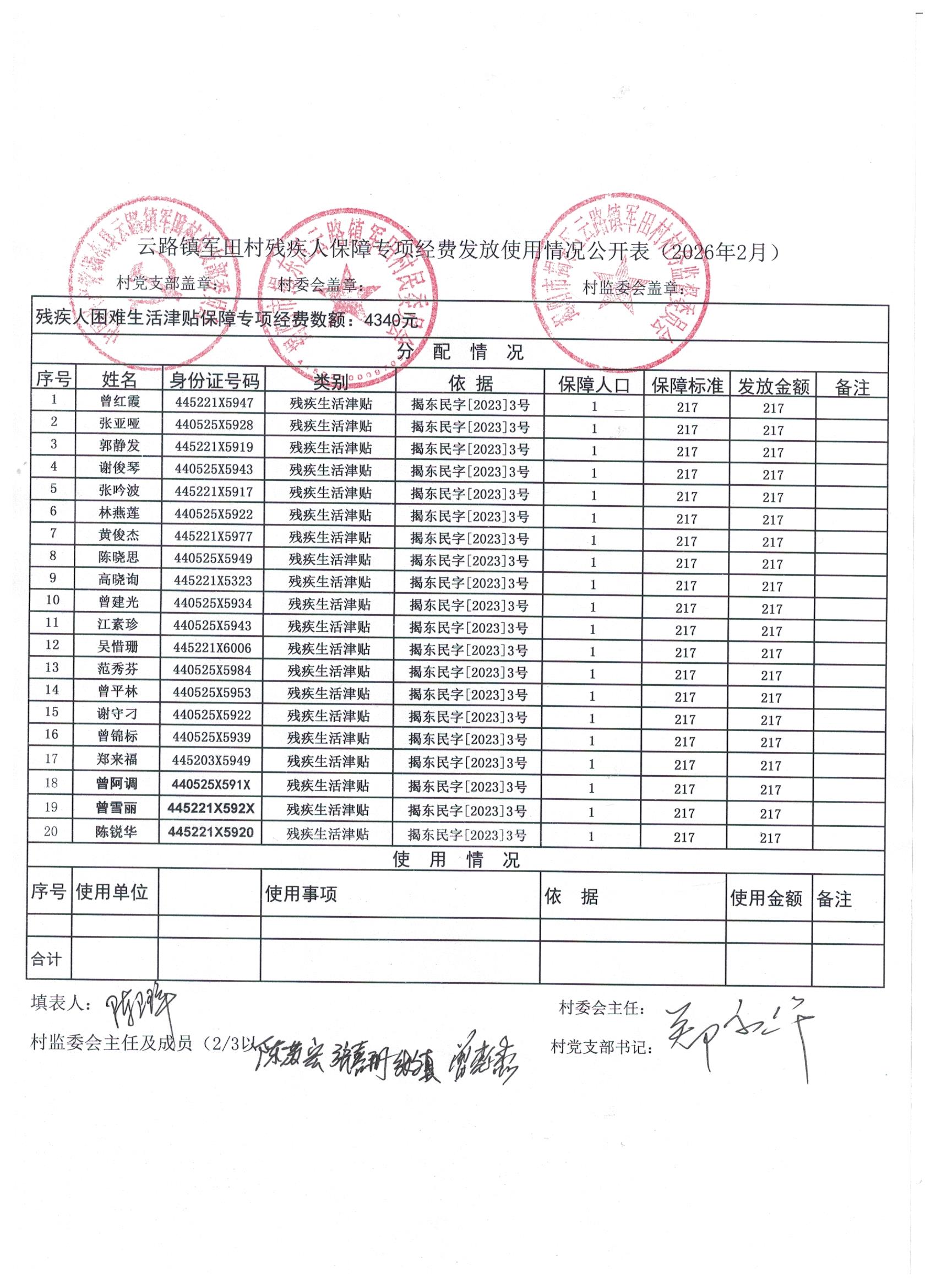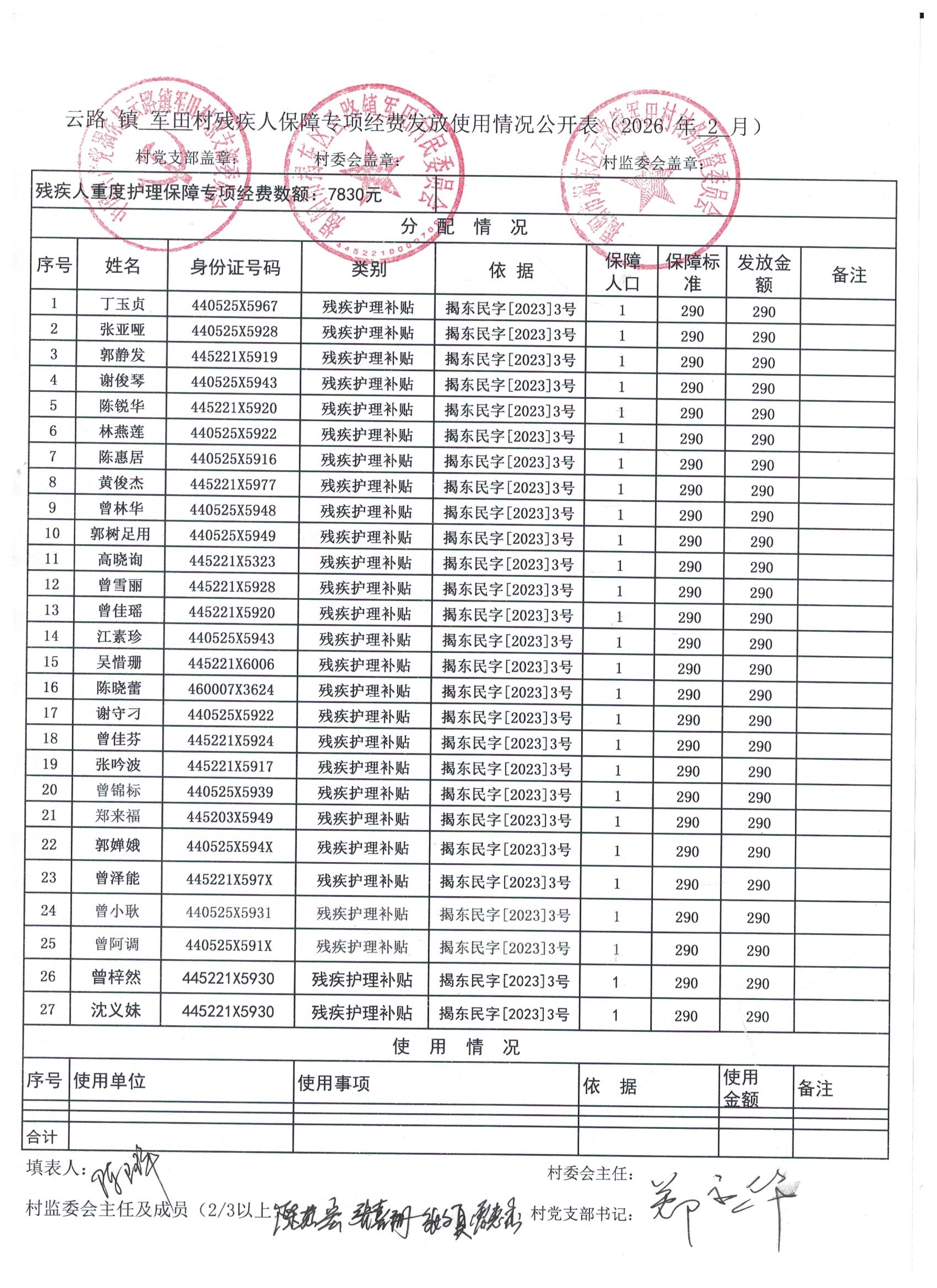 2026年2月残疾人保障专项经费发放使用情况公开表