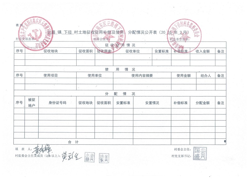 云路镇下径村土地征收征用补偿及使用、分配情况公开表2026年2月