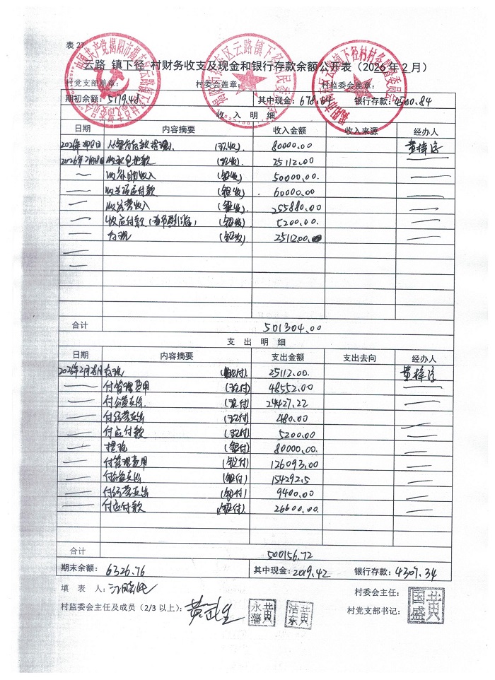 云路镇下径村财务收支及现金和银行存款余额公开表2026年2月
