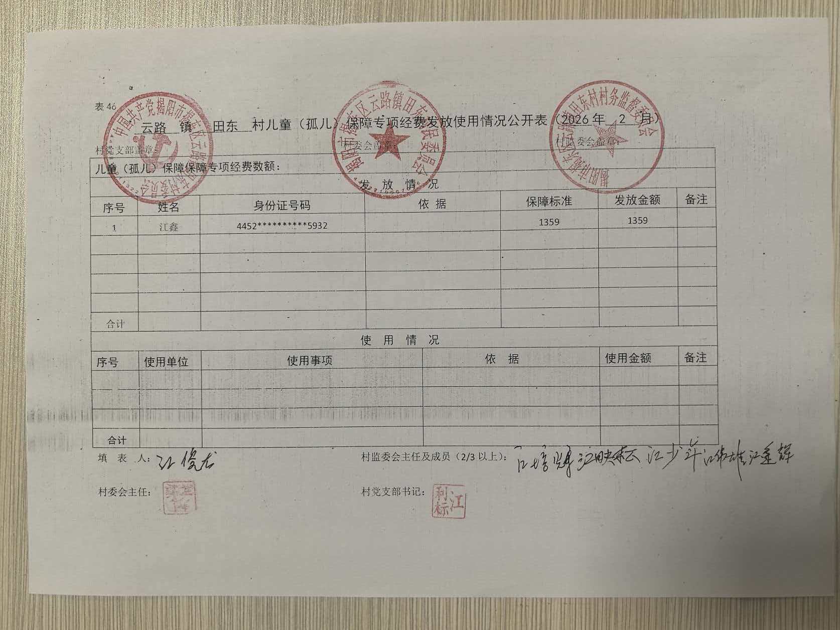 田东村2026年2月孤儿公示