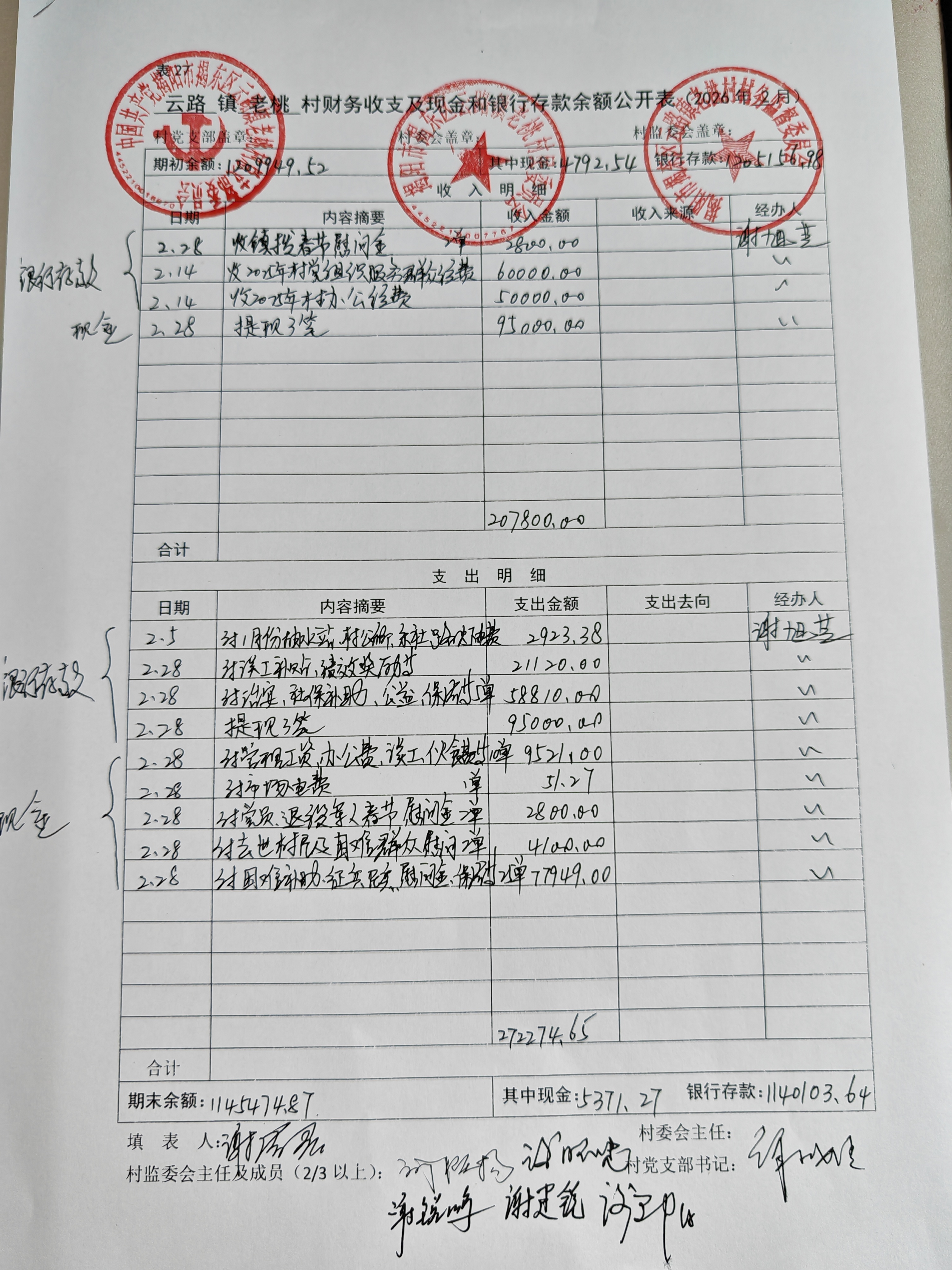 2026年2月份云路镇老桃村财务收支及现金和银行存款余额公开表