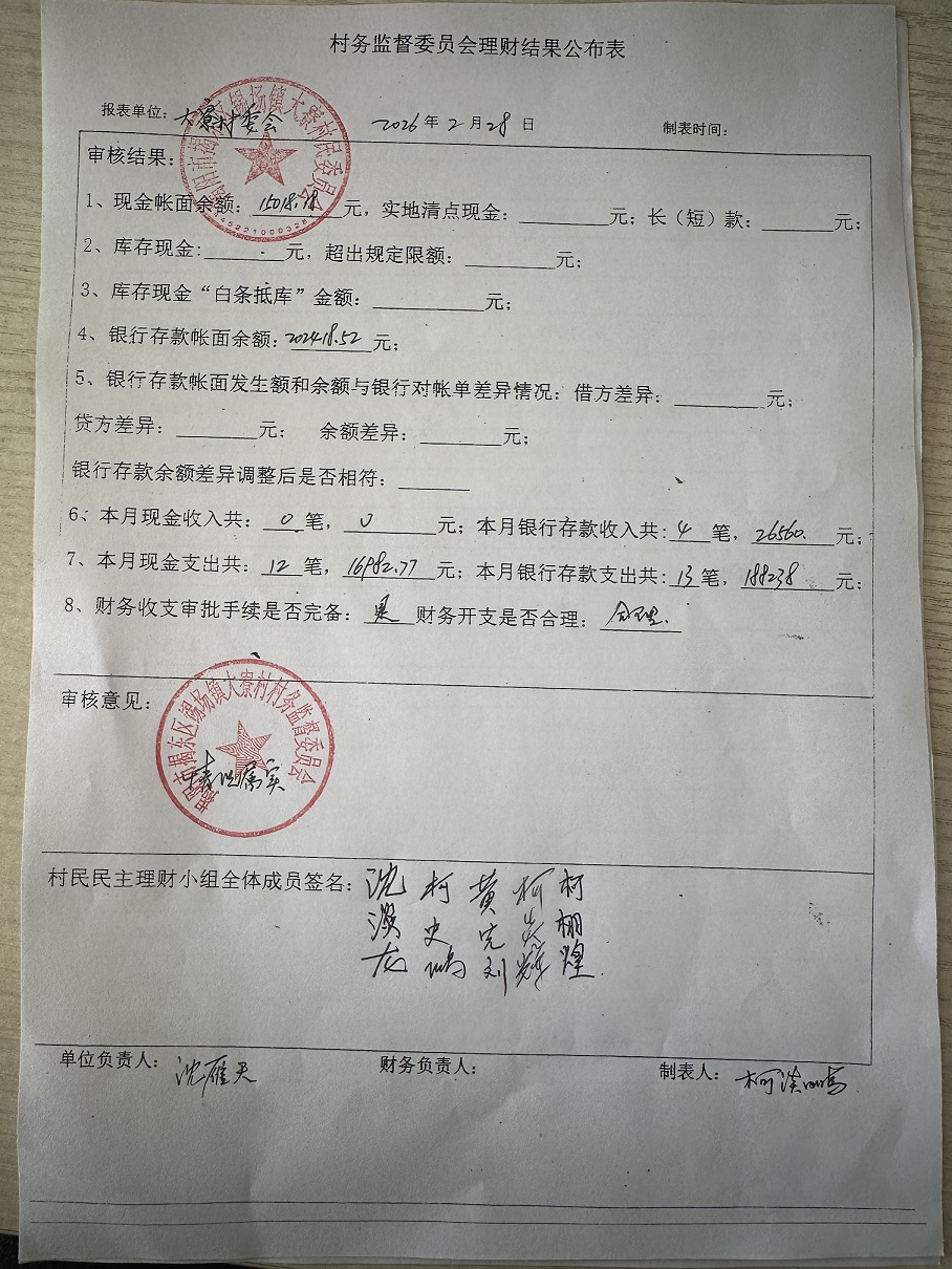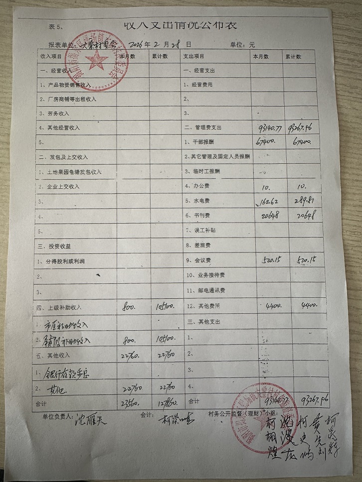 大寮村2026年2月财务收支情况