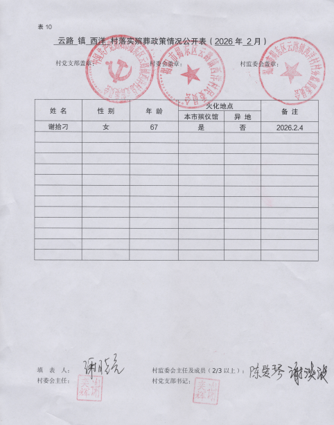 云路镇西洋村落实殡葬政策情况公开表(2026年2月)