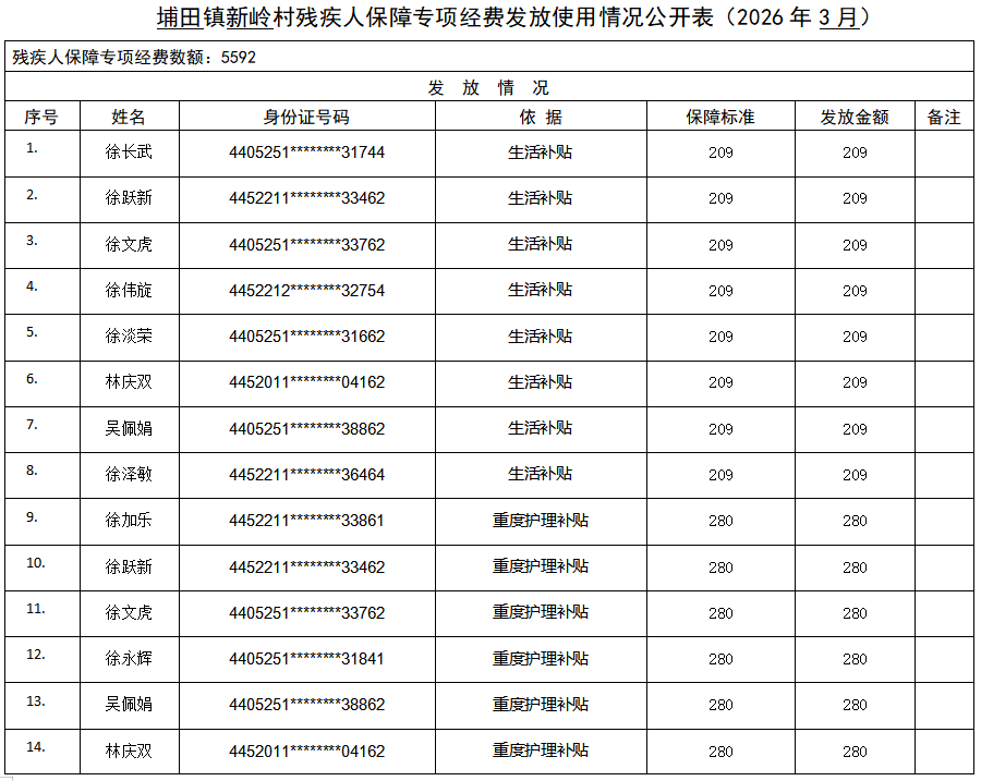 (2026年3月)残疾人保障专项经费的数额、分配、使用情况发放情况