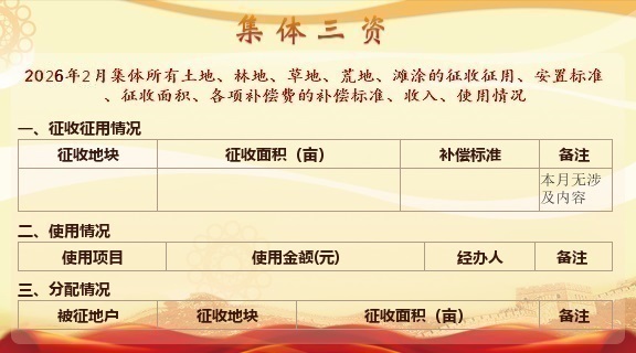 2026年2月集体所有土地、林地、草地、荒地、滩涂的征收征用、安置标准、征收面积、各项补偿费的补偿标准、收入、使用情况