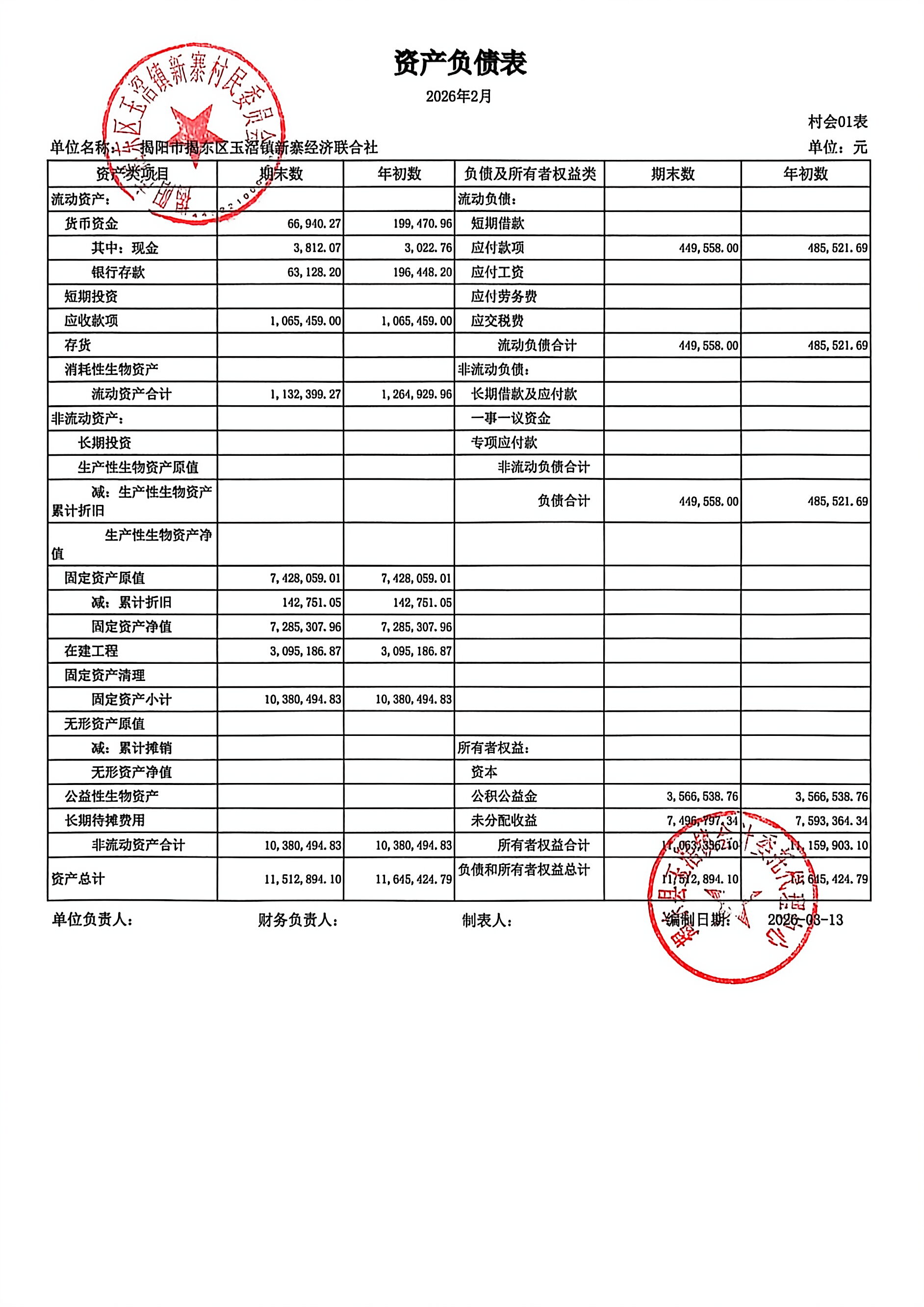 2026年2月新寨村三资情况