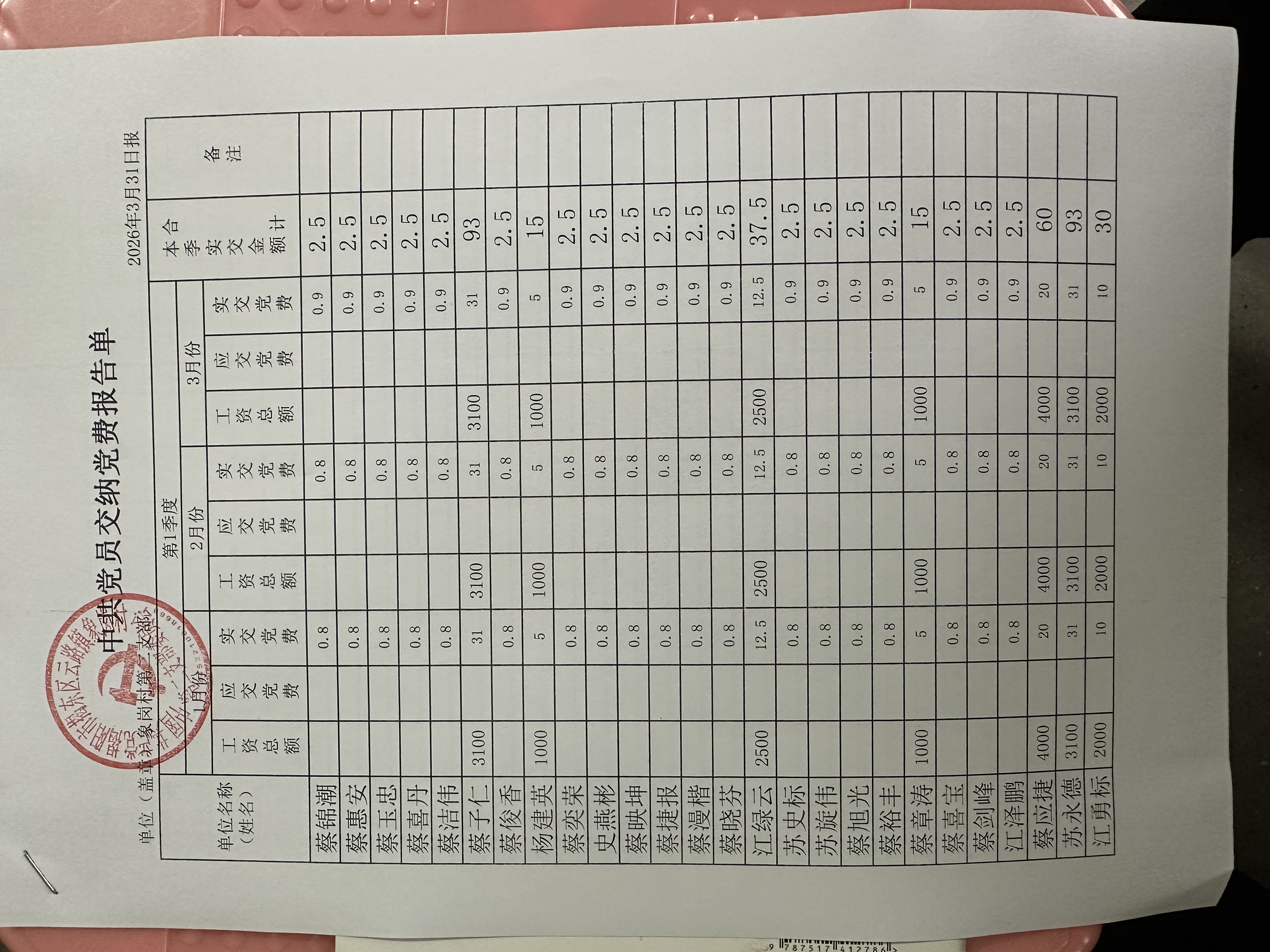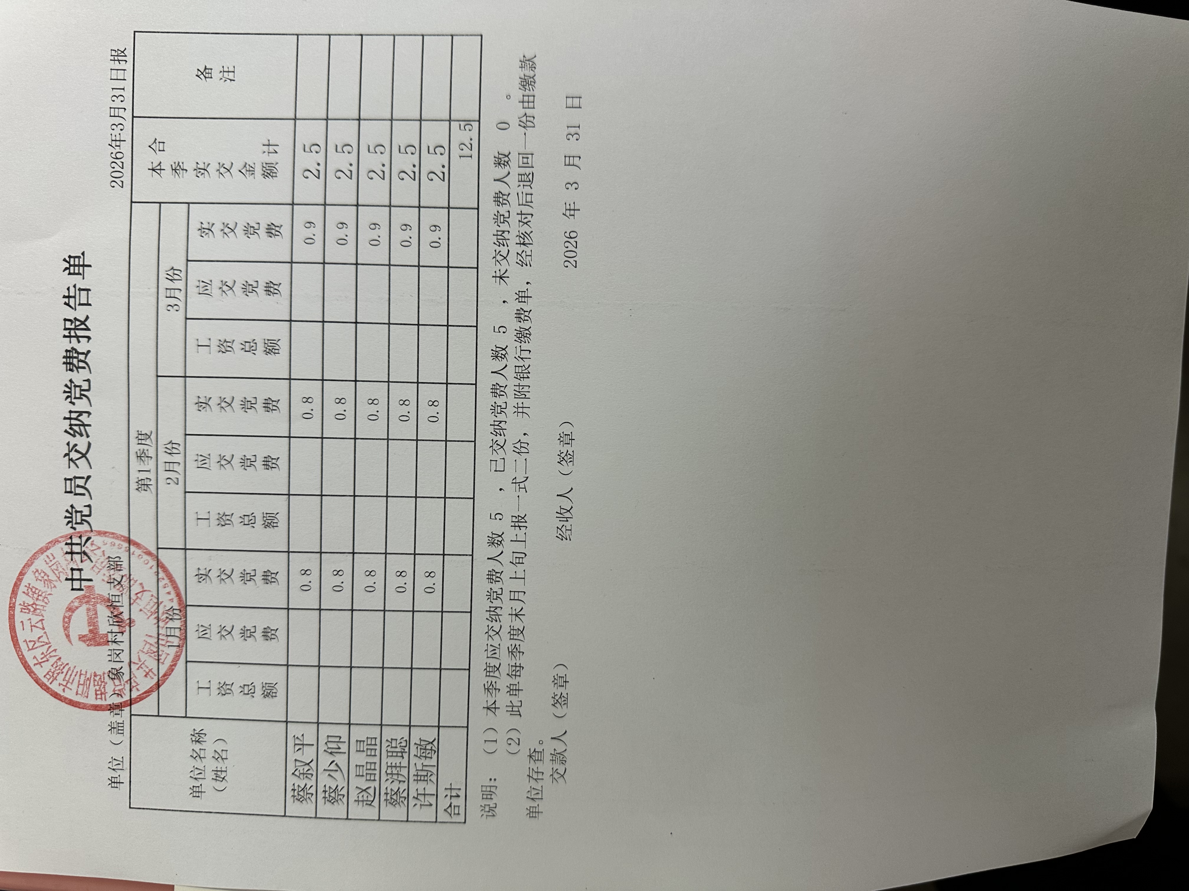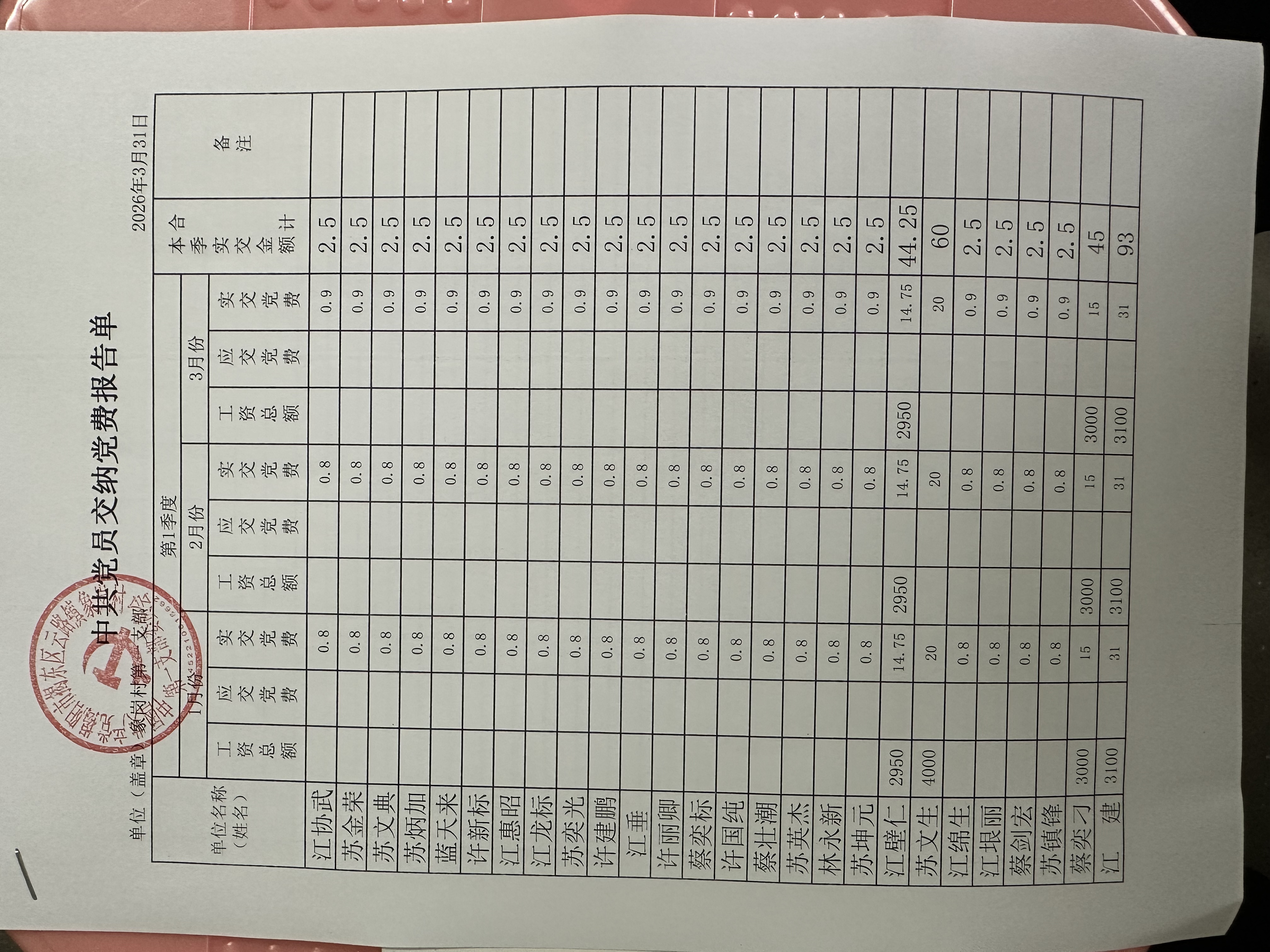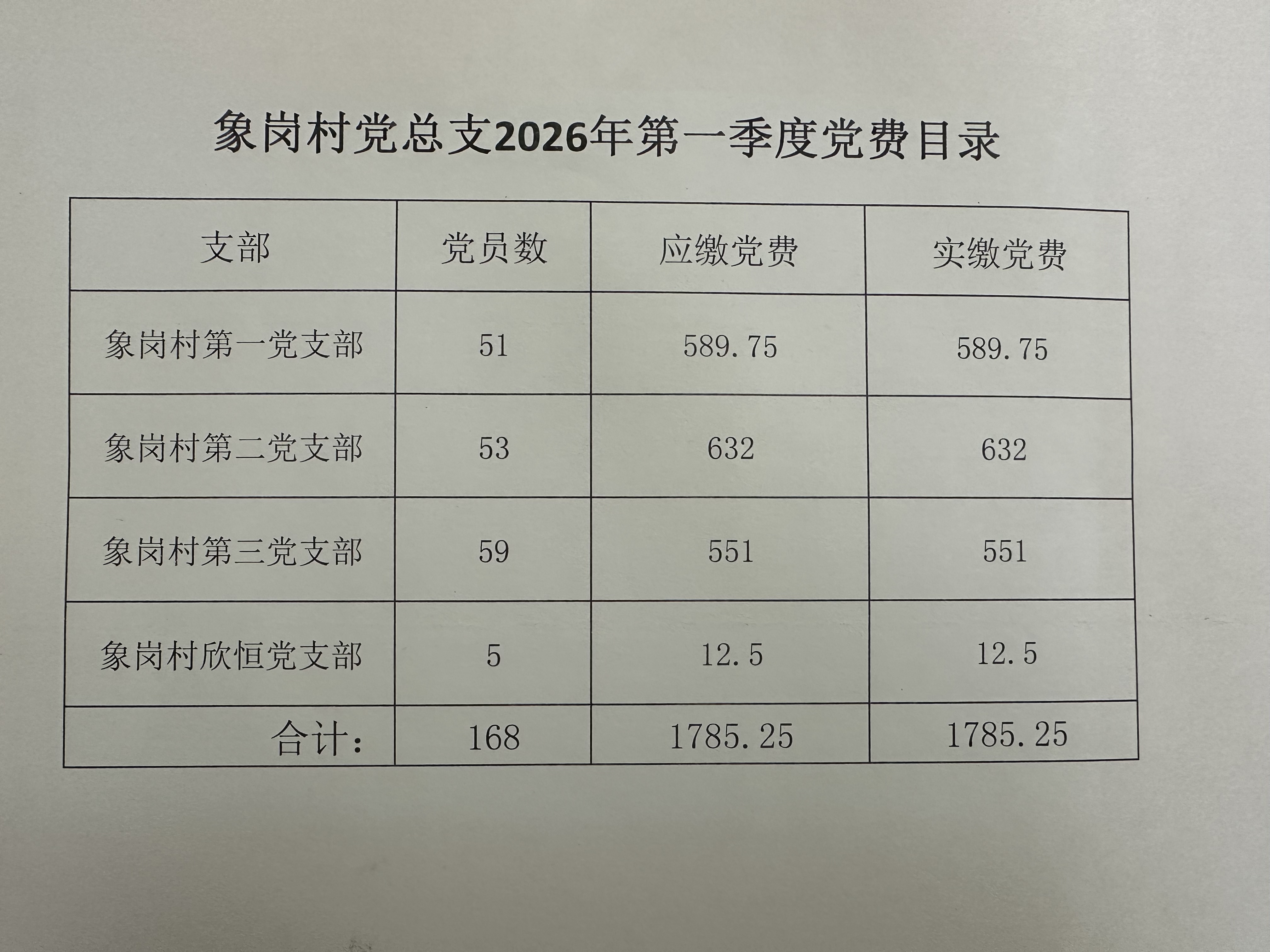 象岗村2026年第一季度党员缴费情况表