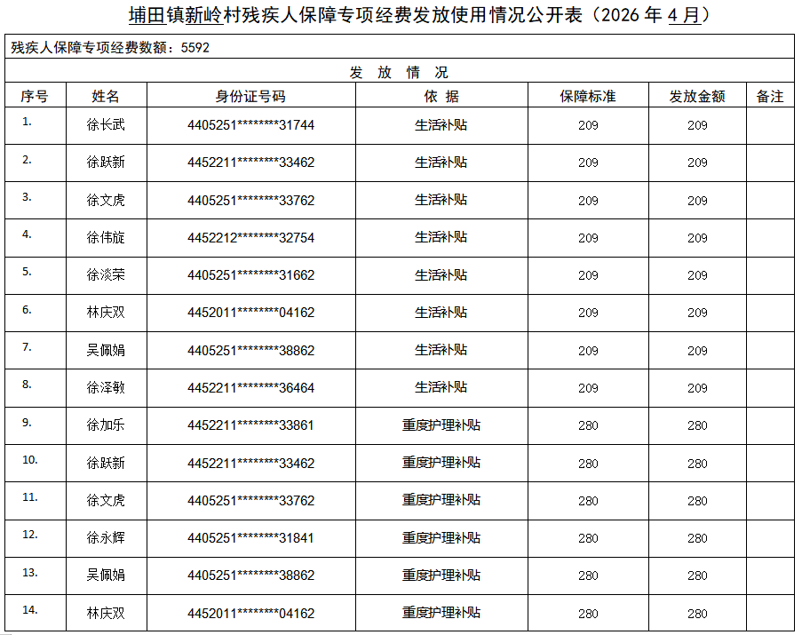 (2026年4月)残疾人保障专项经费的数额、分配、使用情况发放情况