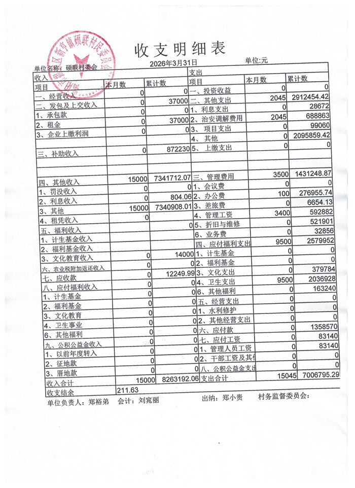 硕联村2026年03月份财务收支情况
